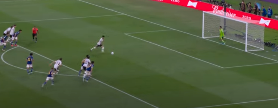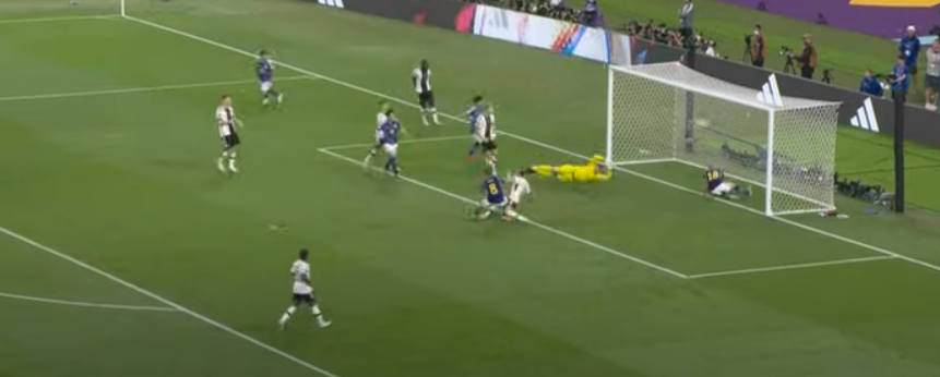 후반 30분, 독일의 골키퍼에게 막힌 슈팅을 도안 리쓰가 다시 슈팅하며 동점골을 만들게 됩니다. 이때부터 분위기는 일본의 기세가 느껴지게 됩니다. 그리고 독일을 응원하는 독일 국민들의 초조한 모습들이 화면에 잡히기도 합니다. 이후 동점골을 넣은 지 8분 뒤 일본 아사노 다쿠마 선수의 골로 역전이 됩니다. 경기는 2:1로 일본의 승리로 종료됩니다. 일본도 세계도 예상치 못한 결과에 놀랐습니다. 경기 종료 후 일본 선수들은 서로 기뻐하며 그라운드를 뛰어다녔습니다. 이번 월드컵 독일과 일본의 경기는 4년 전 월드컵 독일과 한국의 경기와 유사한 면이 있습니다. 4년 전 월드컵에서도 한국이 독일을 이기며 이변을 기록했습니다. 이번 독일의 경기는 실력도 부족했지만 매너도 부족했다는 평을 남겼습니다.